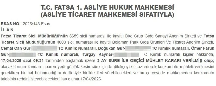 14 yıllık şirket olan Dkc Grup Gıda Sanayi Anonim Şirketi, Bolaman Park Gıda Ürünleri Ve Ticaret Anonim Şirketi ve bu şirketlerin sahipleri olan Cemal Can Gür, Doğukan Gür, Ömer Faruk Gür ve Turgay Kaynar da 3 ayla sınırlı geçici konkordatoya dahil oldu.