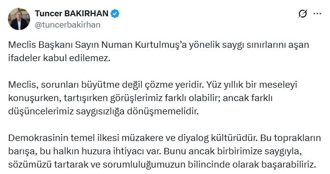 DEM Parti Eş Genel Başkanı Tuncer BakırhanUsta'nın ifadelerine AKP'li isimlerden tepki gelirken bir tepki de DEM Parti Eş Genel Başkanı Tuncer Bakırhan'dan geldi.