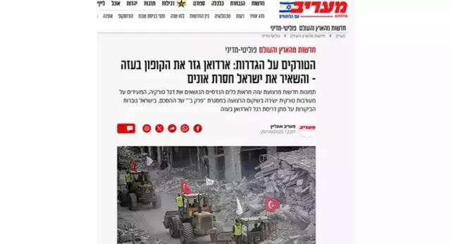 "ANKARA BÖLGESEL ETKİNLİĞİNİ VE DİPLOMATİK GÜCÜNÜ GÖSTERİYOR"Gazze'de Türk bayrağı taşıyan iş makinelerinin aktif biçimde çalıştığını yazan Maariv gazetesi, Türkiye'nin hem diplomatik hem de ekonomik anlamda sürece ilk avantajını sağladığını belirtti. Haberde, sahada hızlı hareket eden Ankara'nın bu şekilde bölgesel etkinliğini ve diplomatik gücünü tüm dünyaya gösterdiği ifade edildi.