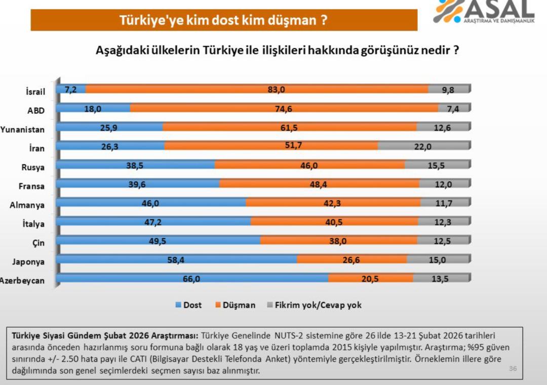 ASAL Araştırma'nın 26 ilde 13-21 Şubat tarihleri arasında CATI (Bilgisayar Destekli Telefonda Anket) yöntemiyle yaptığı anketin sonuçları kamuoyu ile paylaşıldı. "Türkiye'ye kim dost, kim düşman?" başlıklı ankette vatandaşlara, "Aşağıdaki ülkelerin Türkiye ile ilişkileri hakkında görüşünüz nedir?" sorusu yöneltildi.