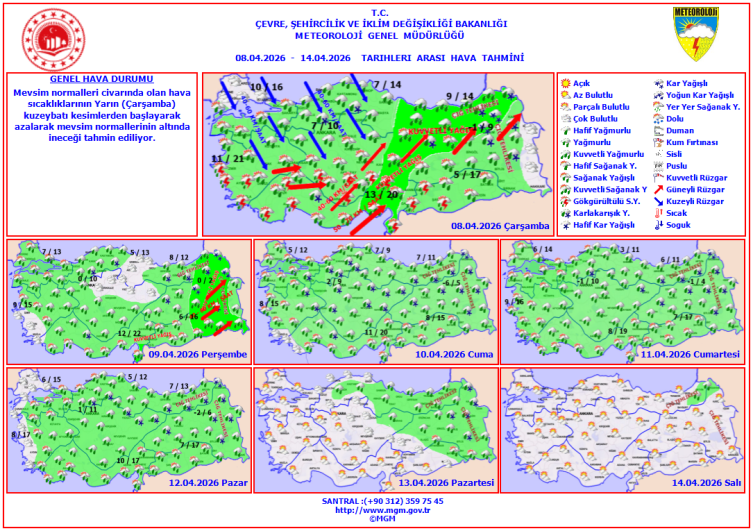 Haftalık rapora göre, bugün Marmara ve Ege üzerinden giriş yapacak olan serin hava ve kuzeyli rüzgarlar, sıcaklıkları hızla düşürecek. İstanbul’da sıcaklıkların 10-16 derece bandına gerilemesi beklenirken, İç Anadolu’da Ankara’da termometreler 7-10 dereceyi gösterecek. Doğu Anadolu’nun iç kesimlerinde ise kuvvetli yağışlar etkili olacak.