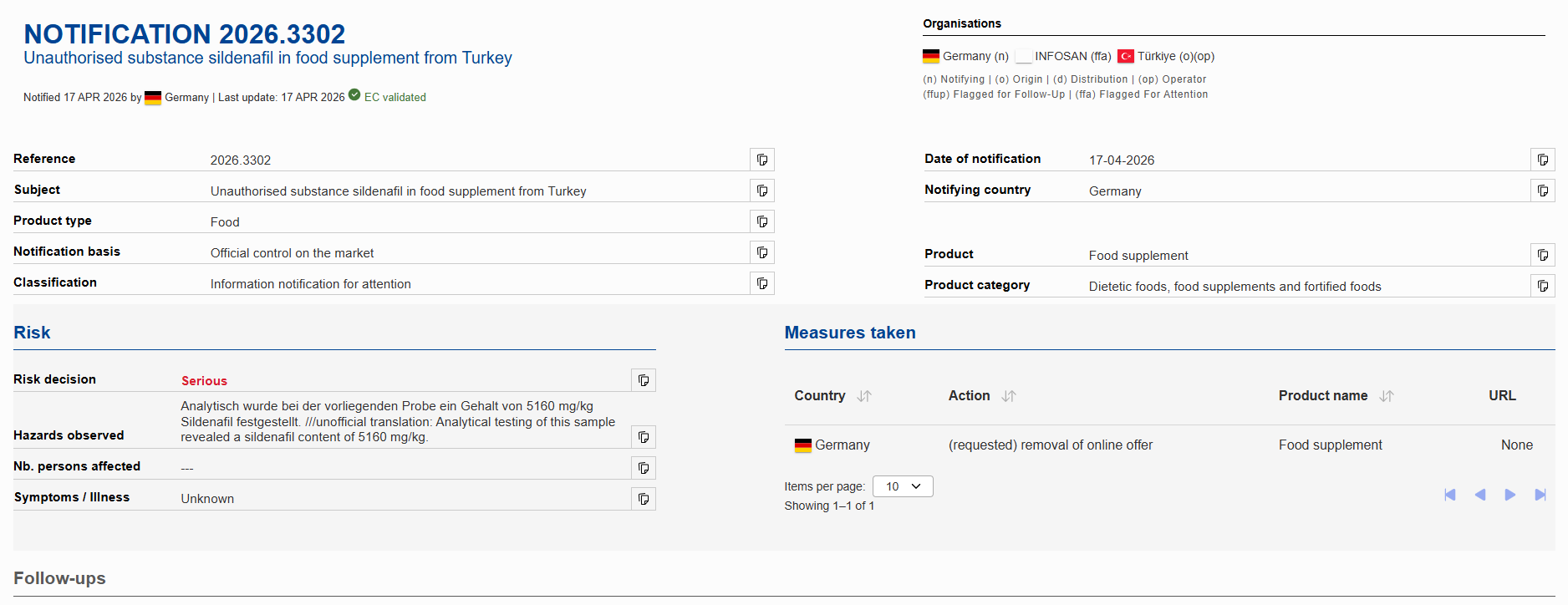 17 Nisan 2026 tarihinde Almanya tarafından yapılan bildirime göre, Türkiye'den ihraç edilen bir gıda takviyesinde yapılan analizler sonucunda, gıdalarda kullanımı yasak olan sildenafil maddesi tespit edildi. Yapılan laboratuvar testlerinde üründe kilogram başına 5160 mg gibi yüksek oranda sildenafil saptandığı belirtildi.