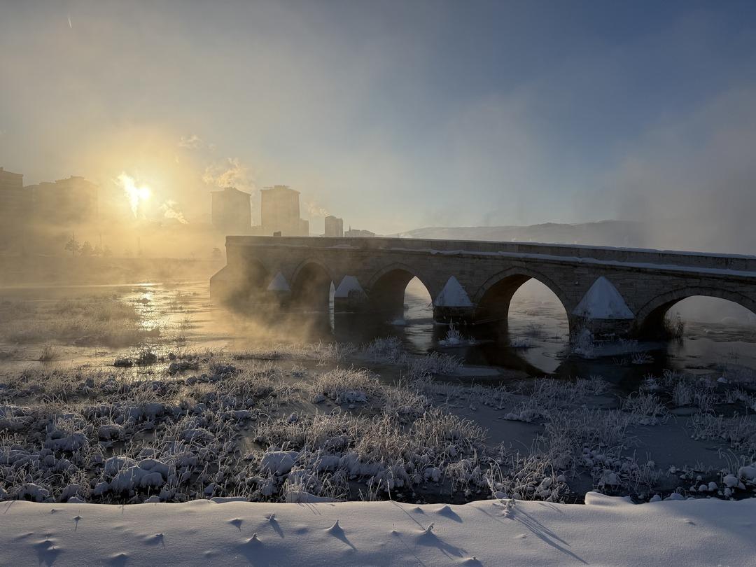 Tarihi Eğri Köprü civarındaki bölümlerde suyun sakin aktığı kısımlarda da buz tabakası oluştu.