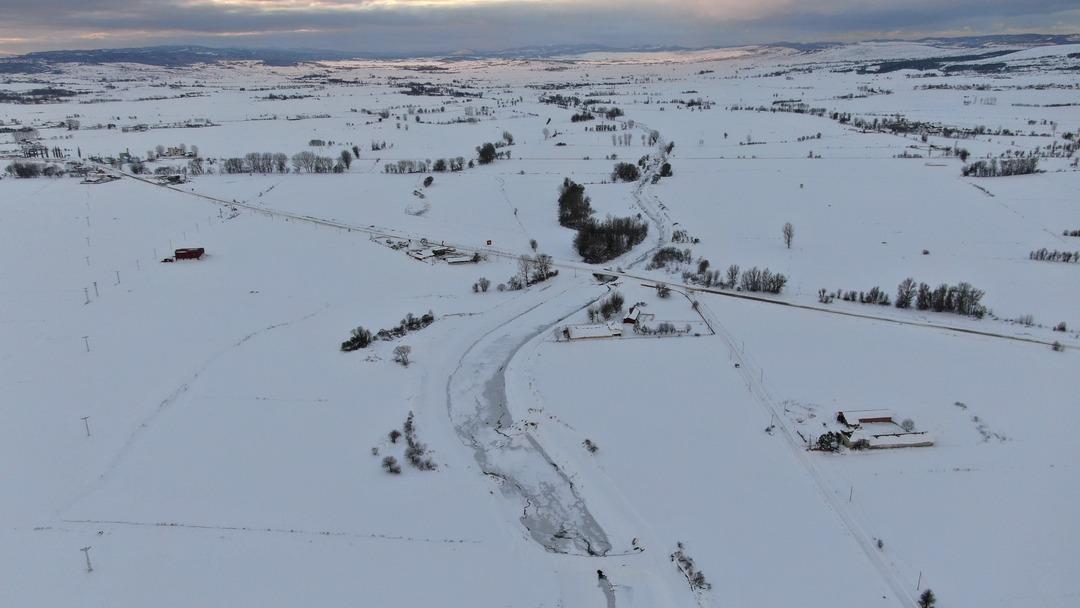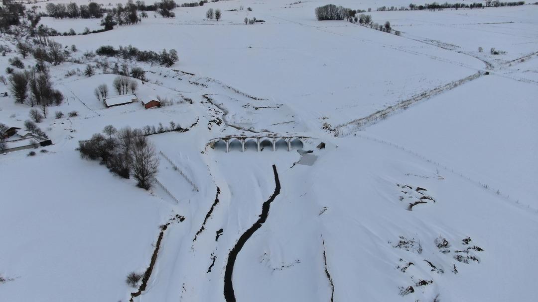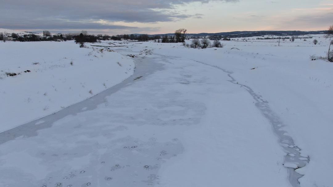 Yüzeyi buzla kaplanan çay, yağan karla da beyaza büründü.