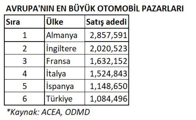 2025'te 1 milyon 84 bin 496 adet otomobilin satıldığı Türkiye ise Avrupa'nın en büyük altıncı pazarı oldu.