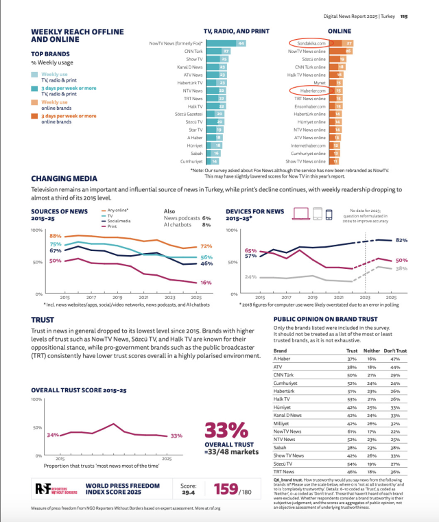 Oxford Üniversitesi ve Reuters Gazetecilik Çalışmaları Enstitüsü'nün 2025 yılına ait Dijital Haber Raporu yayımlandı. Raporda, Türkiye'deki okuyucuların haber kaynaklarına olan güveni ve en çok tercih edilen medya kuruluşları değerlendirildi.