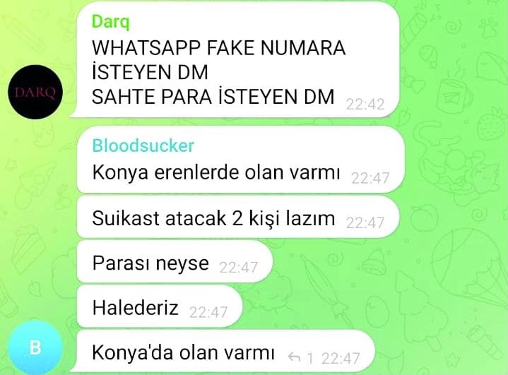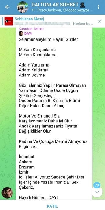 "SOHBET GRUPLARI" ADI ALTINDA YASA DIŞI PAZARMilli Gazete'den Ahmet Sesli'nin haberine göre Telegram gibi şifreli mesajlaşma uygulamalarında "Tetikçi Mekânı", "İstanbul Tetikçi" ve "Daltonlar" gibi isimlerle kurulan gruplarda, suç teşkil eden eylemlerin alınıp satıldığı tespit edildi. Yüzlerce üyenin bulunduğu bu gruplarda, "tahsilat", "darp", "kurşunlama" ve "yurt dışına insan kaçırma" gibi faaliyetler için ilanlar paylaşıldığı görülüyor.