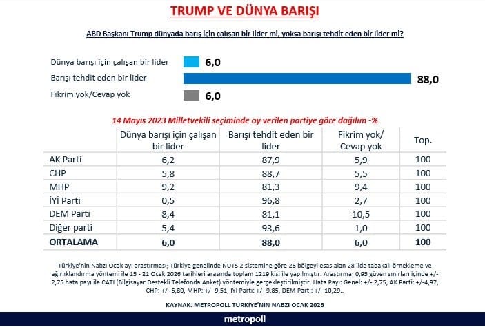 HALKIN SADECE YÜZDE 6'SI "BARIŞ İÇİN ÇALIŞIYOR" DEDİAraştırmanın sonuçlarına göre, halkın ezici bir çoğunluğu olan yüzde 88'lik kesim, Trump'ın dünyada barışı tehdit eden bir lider olduğunu düşünüyor. Trump'ı "dünya barışı için çalışan bir lider" olarak tanımlayanların oranı ise yalnızca yüzde 6'da kaldı. Katılımcıların geri kalan yüzde 6'sı ise bu konuda fikri olmadığını belirtti.