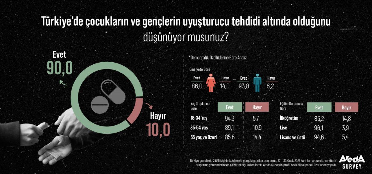 18–34 yaş grubunun yüzde 94,3’ü, 35–54 yaş grubunun yüzde 89,1’i, 55 yaş ve üzeri grubun ise yüzde 85,6’sı çocuklar ve gençlerin uyuşturucu tehdidi altında olduğunu ifade ediyor.