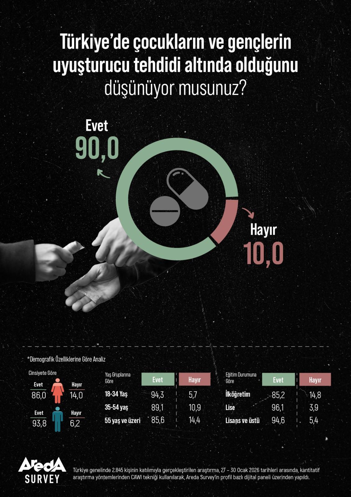 Areda Survey’in Ocak ayı Sosyometre raporunda yer alan uyuşturucu araştırması, toplumun çocuklar ve gençlerin uyuşturucu tehdidi altında olduğuna dair güçlü bir endişe taşıdığını ortaya koydu. Türkiye genelinde 27–30 Ocak 2026 tarihleri arasında 2.845 kişinin katılımıyla gerçekleştirilen araştırmaya göre, Türk halkının yüzde 90’ı çocukların ve gençlerin uyuşturucu tehdidi altında olduğunu düşünüyor. Yüzde 10’u ise böyle bir tehdit olmadığı görüşünde.