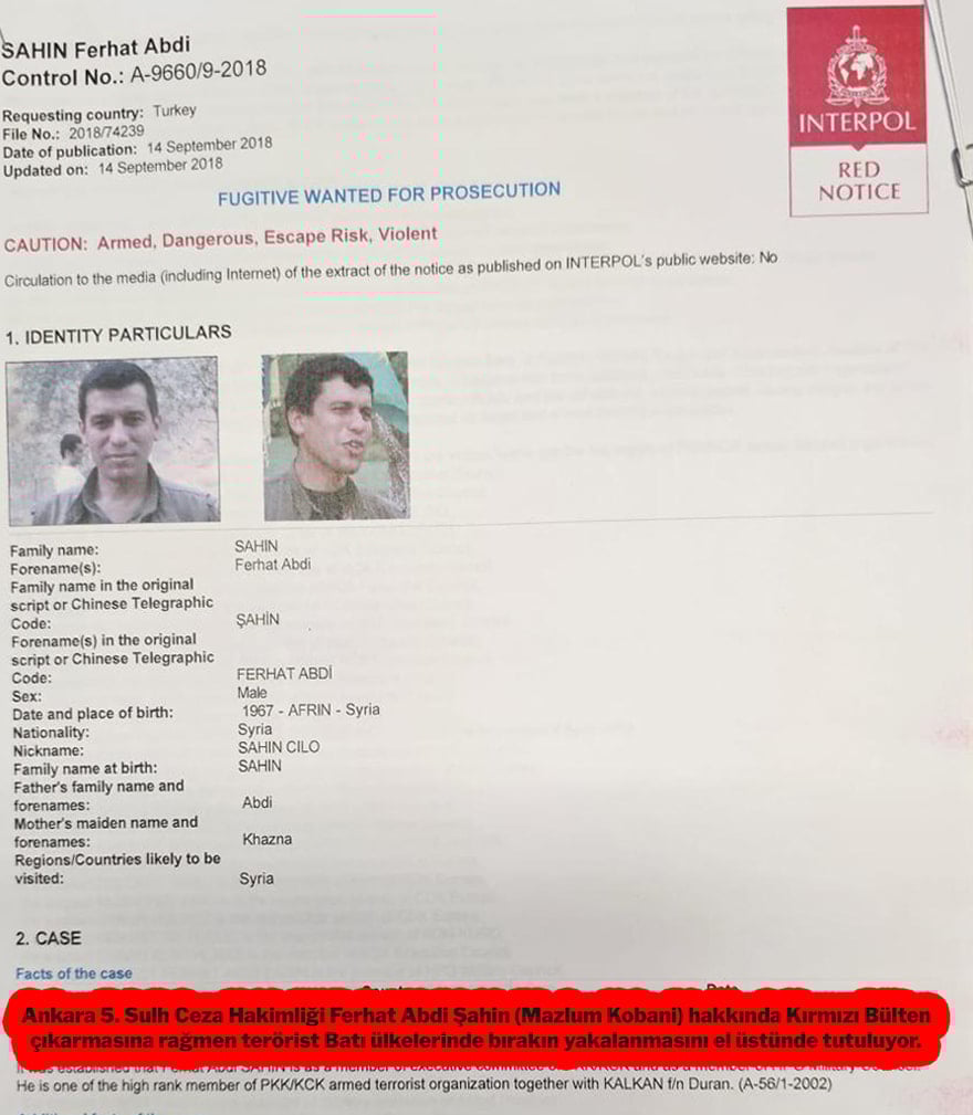 Ankara 5. Sulh Ceza Hakimliği, 2015/1929 sayılı kararıyla Suriye-Afrin doğumlu Ferhat Abdi Şahin (Kod adı Mazlum Kobani) hakkında yakalama kararı çıkarmıştı. Gerekçesi İnterpol’ün kırmızı bülteninde “Şüpheli hakkında silahlı bölücü terör örgütü yöneticisi olması, uzun süredir ülkemiz dışında olup, bu zamana kadar yakalanmaması dikkate alınarak dosya içeriğiyle hakkında tutuklamayı gerektirecek deliller bulunduğu dikkate alınarak yokluğunda tutuklanmasına” diye belirtildi.