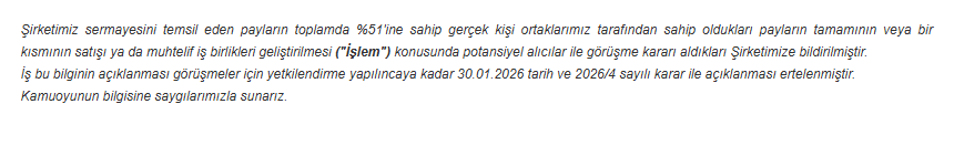 Hisselerin tamamının mı yoksa bir kısmının mı satılacağı, yapılacak görüşmeler neticesinde belirlenecek. Satışın gerçekleşmesi durumunda, sürecin resmi onayların ardından tamamlanması bekleniyor. Şirket, konuyla ilgili somut gelişmeler yaşandıkça kamuoyunu bilgilendirmeye devam edeceğini duyurdu.