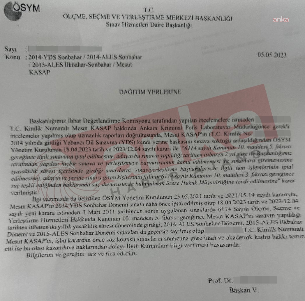 YERİNE BAŞKASINI SOKTUĞU SINAV İPTAL EDİLDİBu tespit üzerine ÖSYM Yönetim Kurulunun 18 Nisan 2023 tarihli kararıyla; sınavı iptal edilen Mesut Kasap'ın, YDS'nin yapıldığı tarihten itibaren 2 yıl süreyle hiçbir sınava ve yerleştirmeye başvurusunun kabul edilmemesine karar verildi. Ayrıca yasaklılık süresi içinde girdiği sınavların başvurularının ve ilgili tüm işlemlerinin iptali kararlaştırıldı. Adayın ve yerine sınava giren kişinin fiili, 6114 sayılı Ölçme, Seçme ve Yerleştirme Merkezi Hizmetleri Hakkında Kanun uyarınca suç teşkil ettiğinden, şahıslar hakkında ayrıca suç duyurusunda bulunuldu.