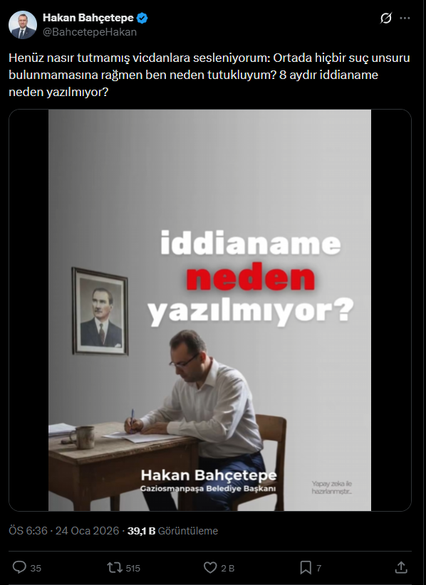 Tutuklu CHP'li Gaziosmanpaşa Belediye Başkanı Hakan Bahçetepe, yapay zeka aracılığıyla seslendirilen paylaşımında, "Henüz nasır tutmamış vicdanlara sesleniyorum: Ortada hiçbir suç unsuru bulunmamasına rağmen ben neden tutukluyum? Kıymetli Gaziosmanpaşalı komşularım, sizce 8 aydır iddianame neden yazılmıyor? " diye isyan etti.
