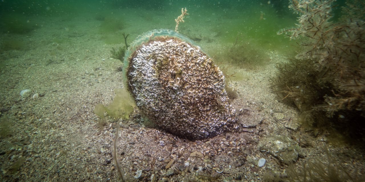 Ocak ayında yaptığımız dalışlar esnasında burada enteresan şekilde çok sağlıklı bir pina popülasyonu ve iskelenin hem sağında hem solunda iki farklı tür deniz çayır alanı tespit ettik. Çok küçücük bir alan kalmış, 50-100 metrekare gibi ama halen doğal habitatın yaşamı sürdürmek için direndiğini bize göstermesi açısından çok kıymetli buluyoruz. Bu deniz çayırı alanında Marmara'nın en yaygın deniz çayırı türlerinden birisi olan Cymodocea nodosa var. Bu deniz çayırı türünün içi komple pinalarla dolu. Bu muhteşem bir şey. Neden muhteşem? Çünkü bu bölge Kuzey Marmara'nın en yoğun endüstriyel bölgelerinden bir tanesi.
