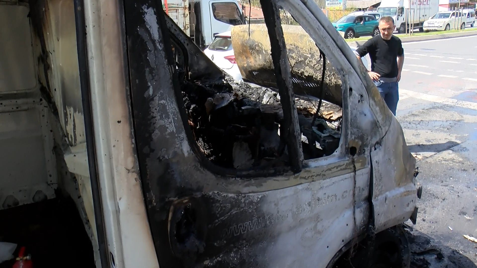 Yaşananları anlatan minibüs şoförü Burak Özkaya, “Bir anda önden dumanlar yükselince kendimi araçtan attım. 3 dakika içinde araç tamamen yandı. Jant taşıyorduk. Ölü ya da yaralı olmaması sevindirici" dedi. (DHA)