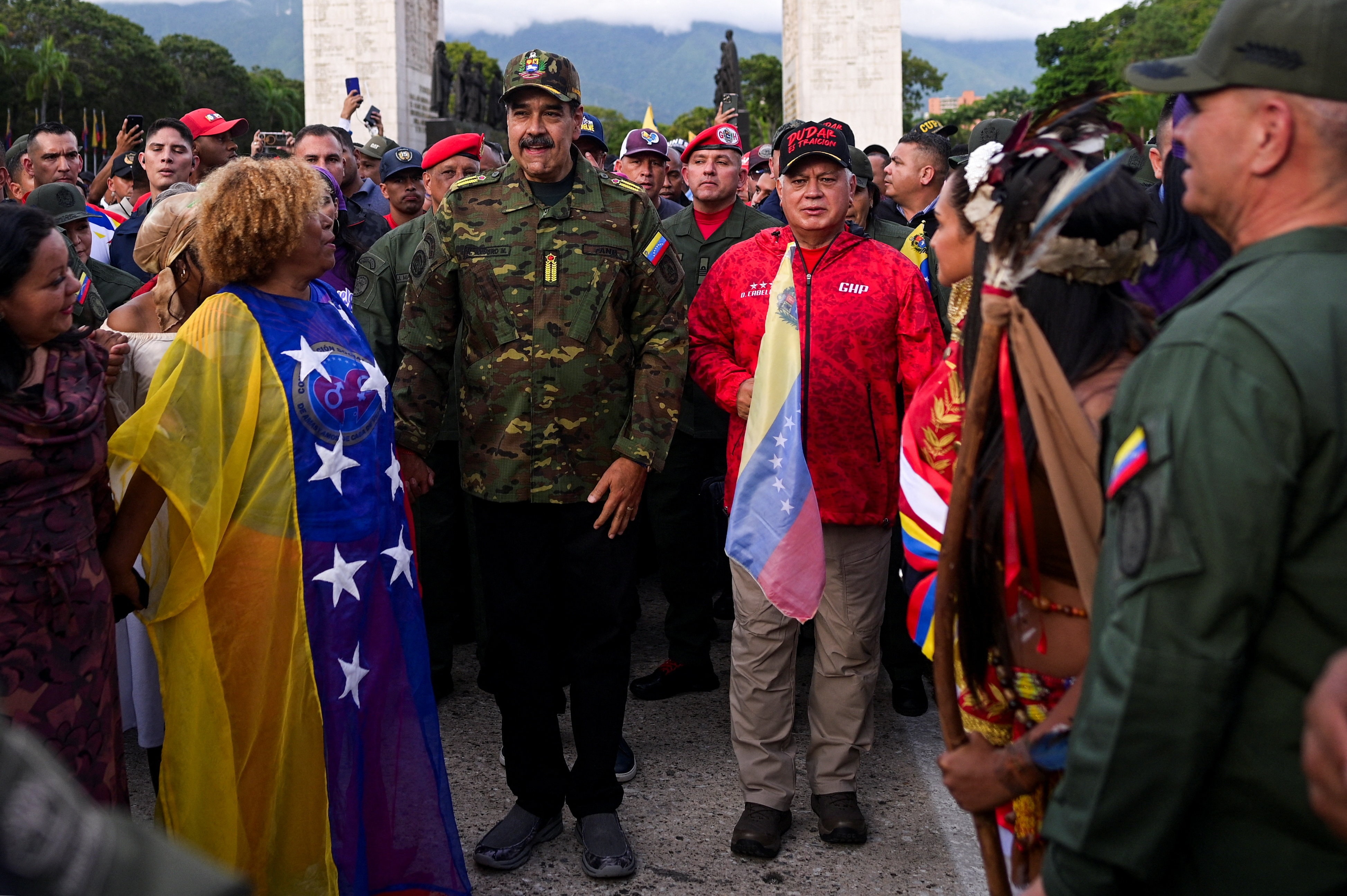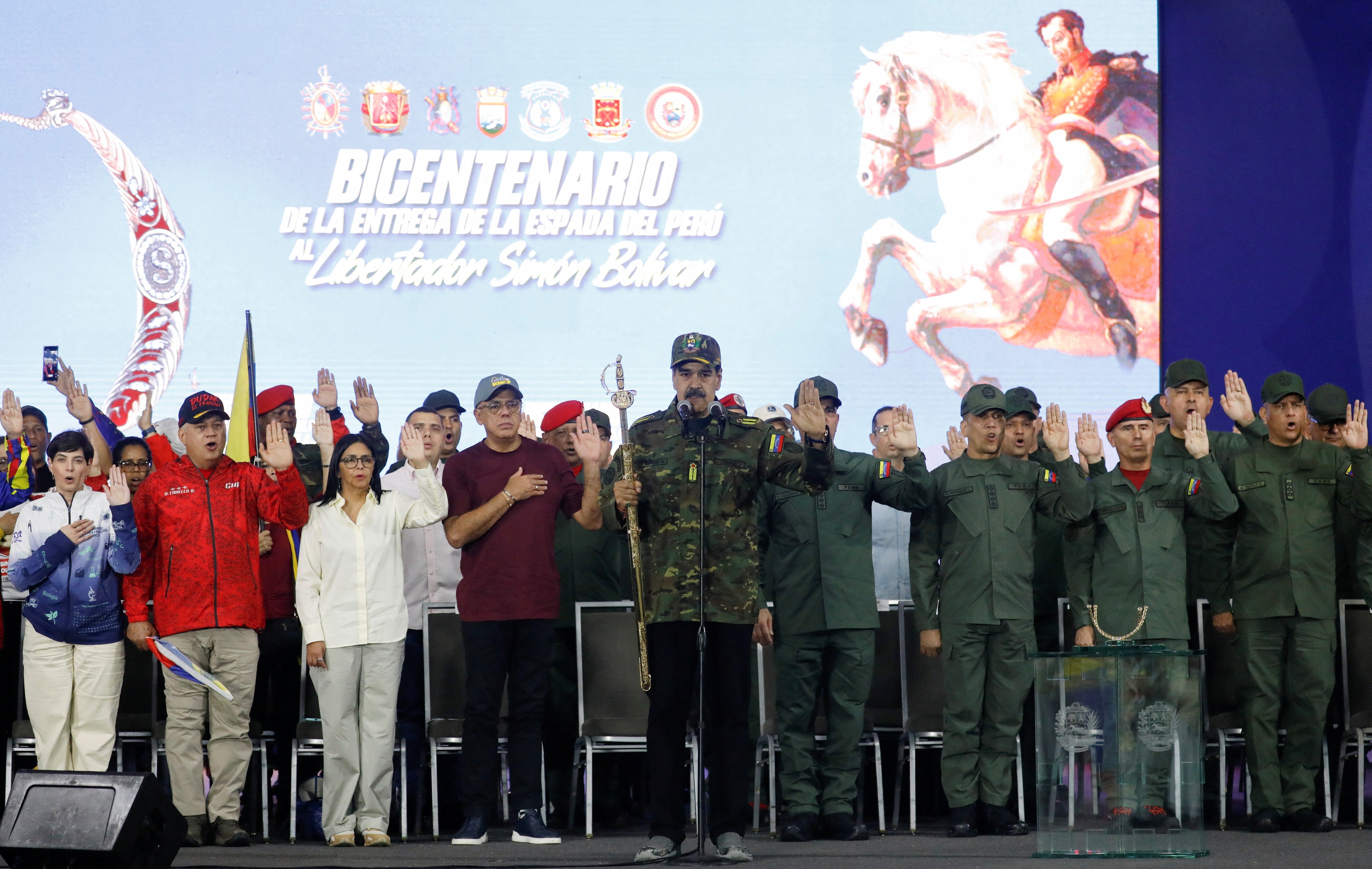 Bugün halkının huzuruna kamuflajlar giymiş olarak çıkan Maduro, "Bolivar'ın kılıcını" kuşandı.