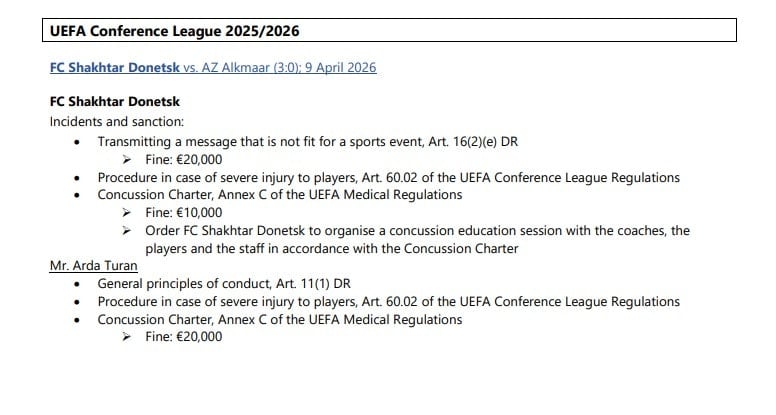 Shakhtar Donetsk, UEFA’nın beyin sarsıntısı protokolünü ihlal ettiği için 10 bin Euro ceza aldı. Teknik direktör Arda Turan da, Isaque Silva'yı beyin sarsıntısı sonrası hemen oyundan çıkarmadığı gerekçesiyle 20 bin Euro para cezasına çarptırıldı.