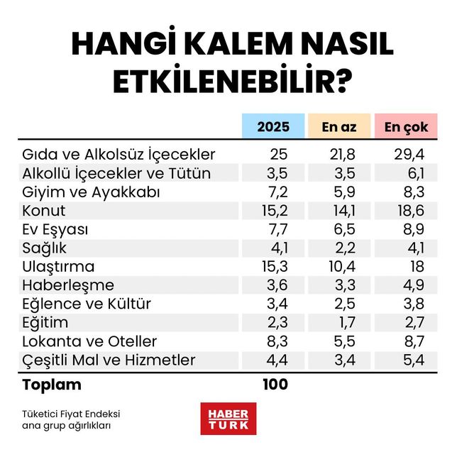 2024 verileri ile yapılan hesapta ağırlığı azalanların başında eğlence ve kültür geliyor. Bu kalemin ağırlığının 3.33'ten 2.18'e iniyor. Mobilyanın payı da 1.12'den 8.08'e düşüyor. Tabii 2025 rakamları ile bu durum değişeceğini aklımızdan çıkarmayalım.
