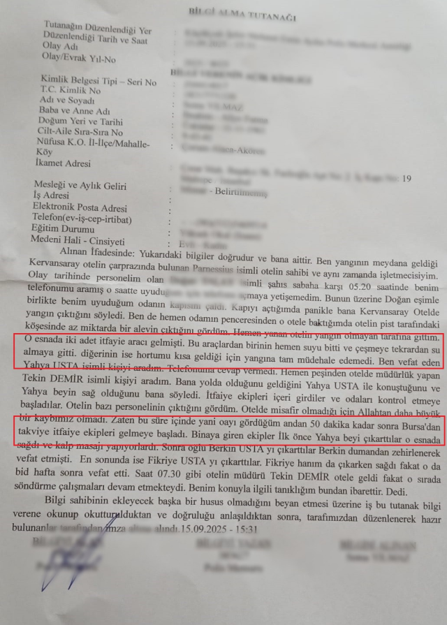 'İTFAİYE ARAÇLARINDAN BİRİNİN SUYU HEMEN BİTTİ, DİĞERİNİN HORTUMU KISAYDI'Avukat Çokal'ın işaret ettiği görgü tanığı S.Y. emniyetteki ifadesinde, yangına müdahale için gelen iki itfaiye aracından birinin suyunun hemen bittiğini, diğer aracın ise hortumunun kısa olduğunu söyledi. İlk başta alevlerin çok az olduğunu, 45 dakika mesafedeki kent merkezinden takviye itfaiye ekipleri beklendiği sırada yangının bütün oteli sardığını belirten S.Y. ifadesinde şunları söyledi: