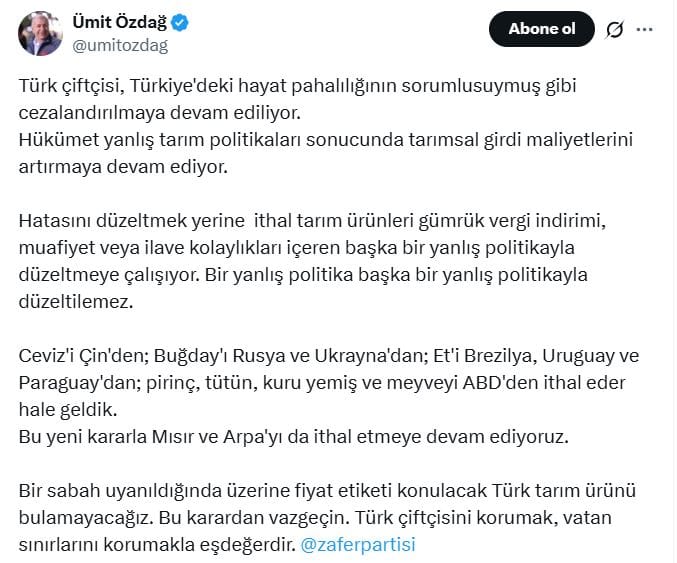Söz konusu kararın yerli üreticiye zarar vereceğine dikkat çeken Zafer Partisi Genel Başkanı Ümit Özdağ, "Türk çiftçisi, Türkiye'deki hayat pahalılığının sorumlusuymuş gibi cezalandırılmaya devam ediliyor. Hükümet yanlış tarım politikaları sonucunda tarımsal girdi maliyetlerini artırmaya devam ediyor" dedi.