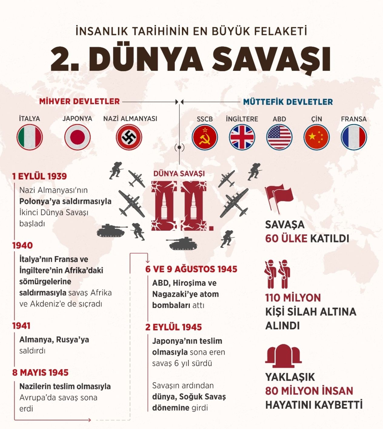 DÜNYA NÜFUSUNUN % 3'Ü HAYATINI KAYBETTİ 1 Eylül 1939'da başlayıp, 2 Eylül 1945'te sona eren II. Dünya Savaşı'nda asker ve sivil olmak üzere dünya nüfusunun yaklaşık % 3'ü hayatını kaybetti.