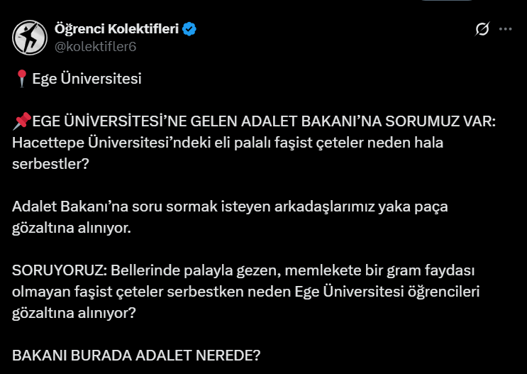 Söz konusu paylaşımda, "Adalet Bakanı’na soru sormak isteyen arkadaşlarımız yaka paça gözaltına alınıyor. SORUYORUZ: Bellerinde palayla gezen, memlekete bir gram faydası olmayan faşist çeteler serbestken neden Ege Üniversitesi öğrencileri gözaltına alınıyor? BAKANI BURADA ADALET NEREDE?" ifadelerine yer verildi.