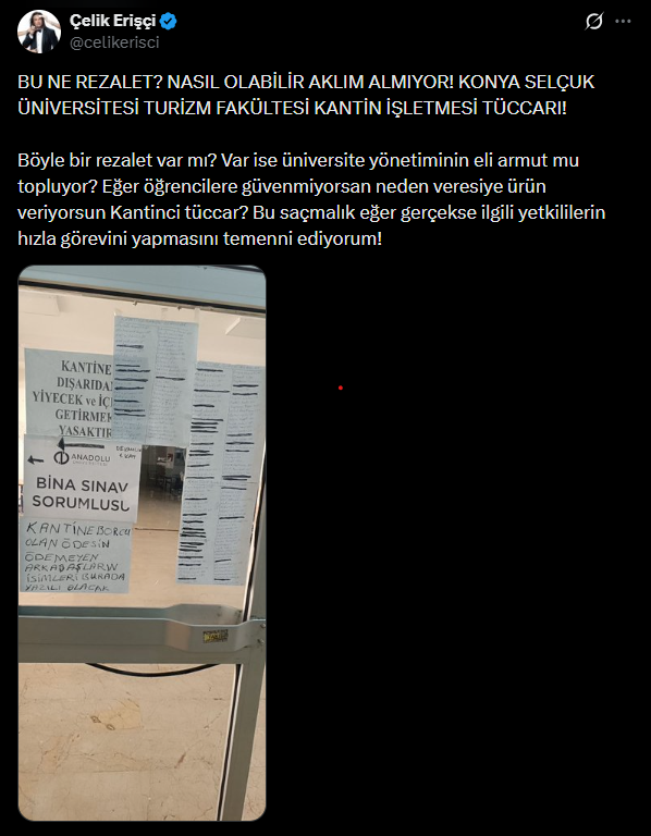 ÇELİK'TEN ÜNİVERSİTE YÖNETİMİNE TEPKİŞarkıcı Çelik Erişçi'de sosyal medya hesabından Selçuk Üniversitesi'nde yaşananlara tepki gösterdi. Üniversite yönetimini göreve çağıran Çelik paylaşımında “Bu ne rezalet? Nasıl olabilir aklım almıyor! Böyle bir durum gerçekten varsa, üniversite yönetimi neden müdahale etmiyor? Öğrencilere güvenilmiyorsa neden veresiye satış yapılıyor?” ifadelerini kullandı.