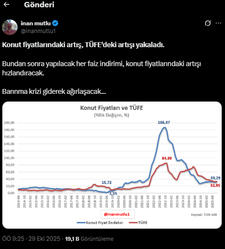 İktisatçı İnan Mutlu, sosyal medya hesabından konut fiyatlarına ilişkin paylaşımda bulundu. Mutlu yaptığı paylaşımda, “Konut fiyatlarındaki artış, TÜFE’deki artışı yakaladı. Bundan sonra yapılacak her faiz indirimi, konut fiyatlarındaki artışı hızlandıracak. Barınma krizi giderek ağırlaşacak” ifadelerini kullandı.