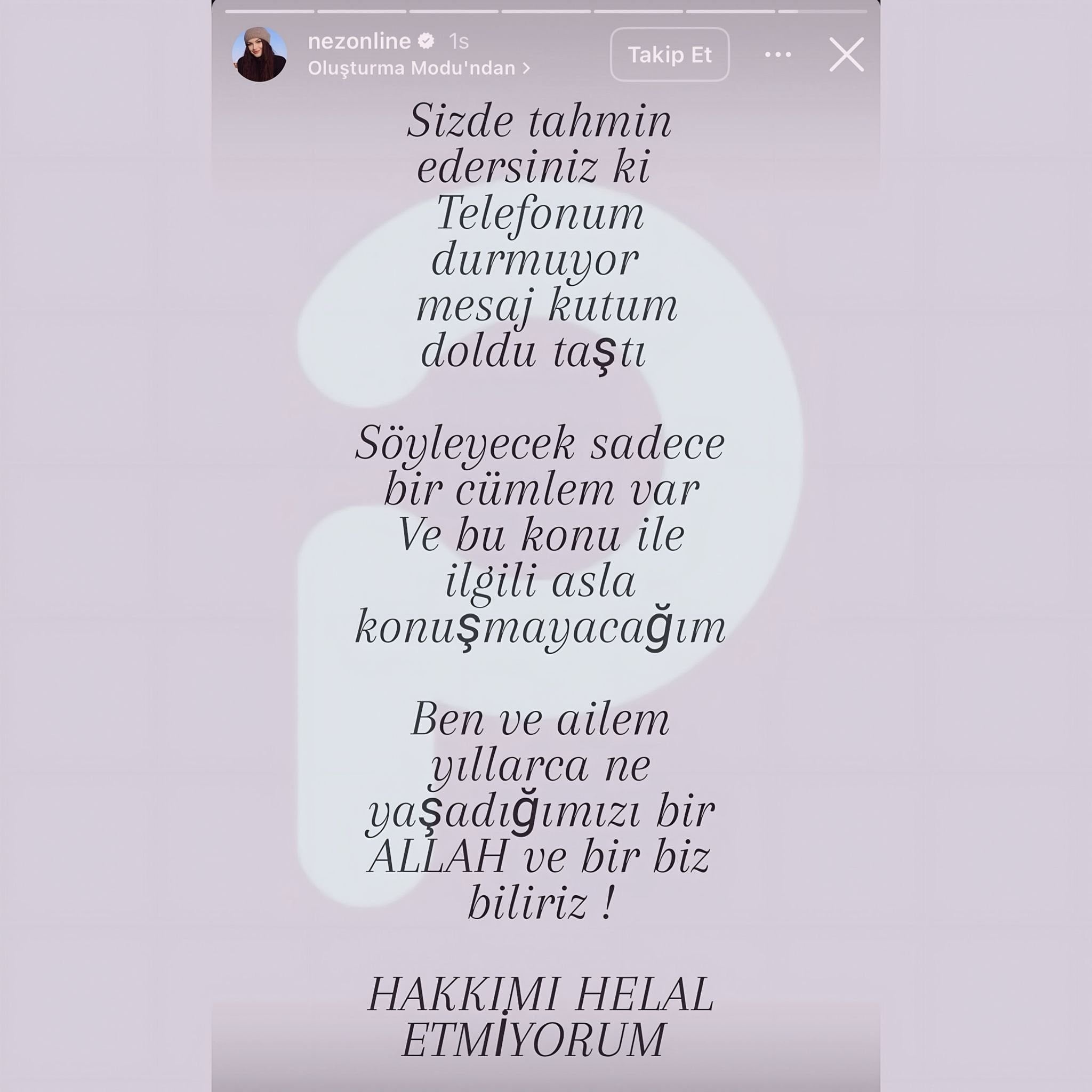 Şarkıcı Nez de yaşadıkları zorluklara dikkat çekerek, "Ben ve ailem yıllarca ne yaşadığımızı yalnızca Allah ve biz biliriz. Hakkımı helal etmiyorum" dedi.