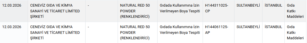İstanbul Sultanbeyli'de, Ceneviz Gıda Ve Kimya Sanayi Ve Ticaret Limited Şirketi tarafından üretilen Natural Red 50 Powder (renklendirici) adlı gıda boyası ürününde de gıda kullanımında izin verilmeyen boya olduğu tespit edildi.