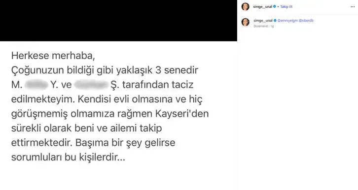 Ünal paylaşıma, Emniyet Genel Müdürlüğü'nü (EGM) de etiketleyerek "Çoğunuzun bildiği gibi yaklaşık 3 senedir M. A. Y. ve G. Ş. tarafından taciz edilmekteyim. Kendisi evli olmasına ve hiç görüşmemiş olmamıza rağmen Kayseri'den sürekli olarak beni ve ailemi takip ettirmektedir. Başıma bir şey gelirse sorumluları bu kişilerdir" ifadelerine yer verdi.