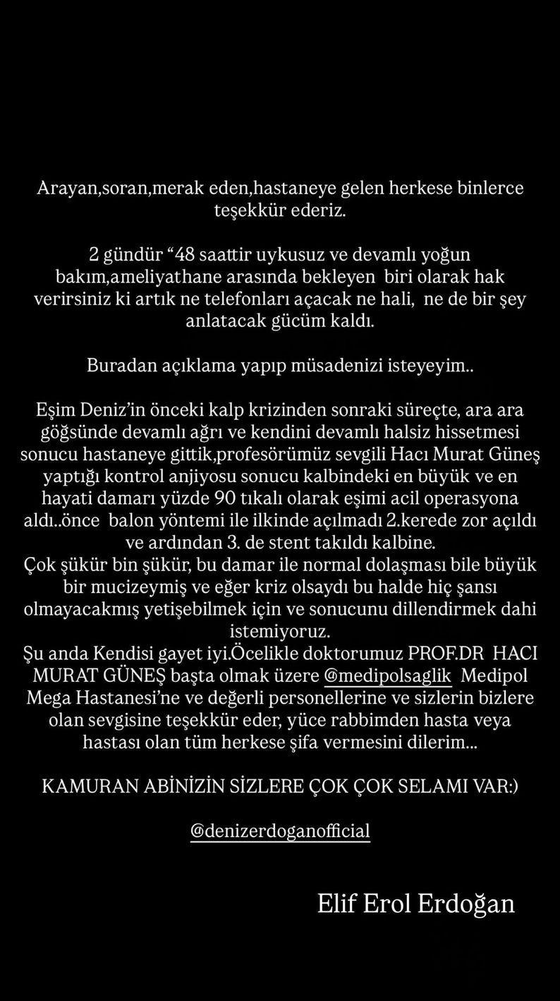 Elif Erol Erdoğan, son 48 saattir yoğun bakım ve ameliyathane arasında geçen zorlu süreci şöyle anlattı; "Arayan, soran, merak eden, hastaneye gelen herkese binlerce teşekkür ederiz. 48 saattir uykusuz ve sürekli yoğun bakım – ameliyathane arasında bekleyen biri olarak artık ne telefonlara bakacak hâlim ne de bir şey anlatacak gücüm kaldı.