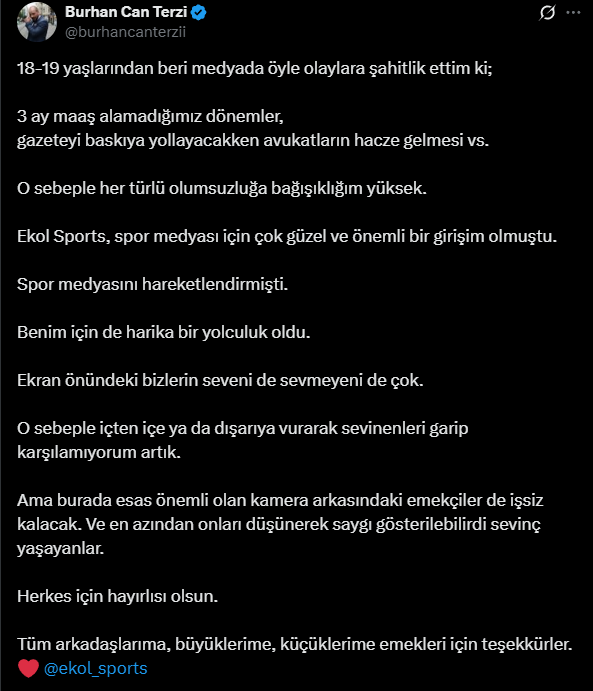 “SPOR MEDYASI İÇİN ÇOK GÜZEL VE ÖNEMLİ BİR GİRİŞİM OLMUŞTU”Yorumcu Burhan Can Terzi ise "18-19 yaşlarından beri medyada öyle olaylara şahitlik ettim ki; 3 ay maaş alamadığımız dönemler, gazeteyi baskıya yollayacakken avukatların hacze gelmesi vs. O sebeple her türlü olumsuzluğa bağışıklığım yüksek. Ekol Sports, spor medyası için çok güzel ve önemli bir girişim olmuştu. Spor medyasını hareketlendirmişti. Benim için de harika bir yolculuk oldu. Ekran önündeki bizlerin seveni de sevmeyeni de çok. O sebeple içten içe ya da dışarıya vurarak sevinenleri garip karşılamıyorum artık. Ama burada esas önemli olan kamera arkasındaki emekçiler de işsiz kalacak. Ve en azından onları düşünerek saygı gösterilebilirdi sevinç yaşayanlar. Herkes için hayırlısı olsun. Tüm arkadaşlarıma, büyüklerime, küçüklerime emekleri için teşekkürler” sözlerini sarf etti.