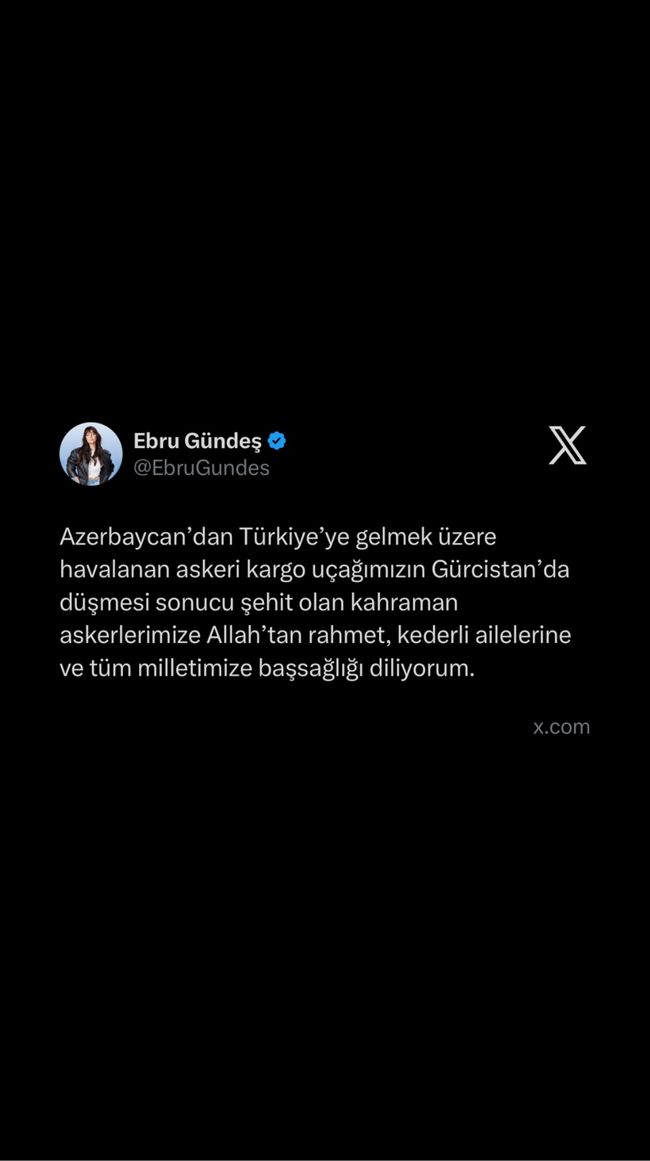 Ebru Gündeş: Azerbaycan'dan Türkiye'ye gelmek üzere havalanan askeri kargo uçağımızın Gürcistan'da düşmesi sonucu şehit olan kahraman askerlerimize Allah'tan rahmet, kederli ailelerine ve tüm milletimize başsağlığı diliyorum.