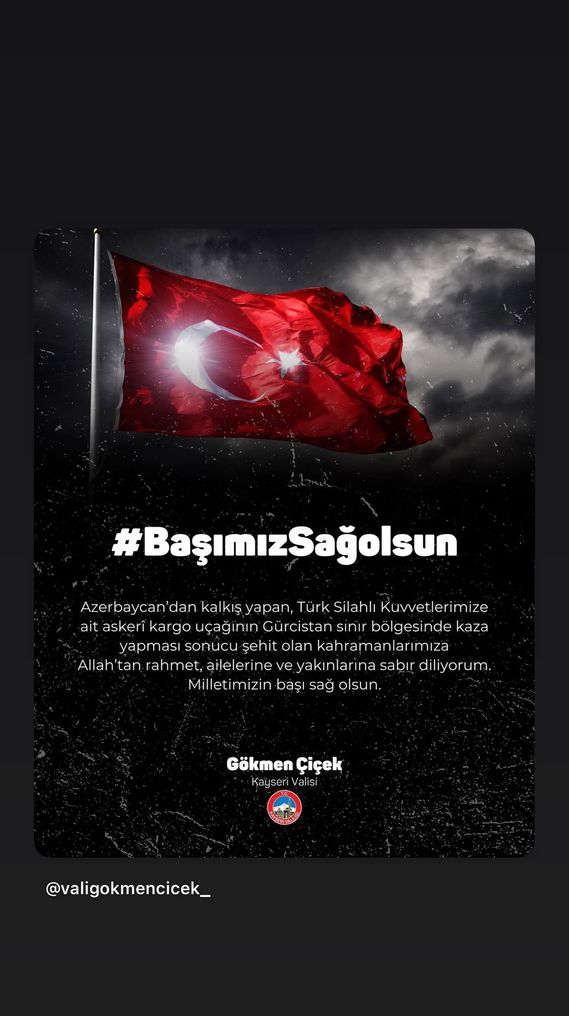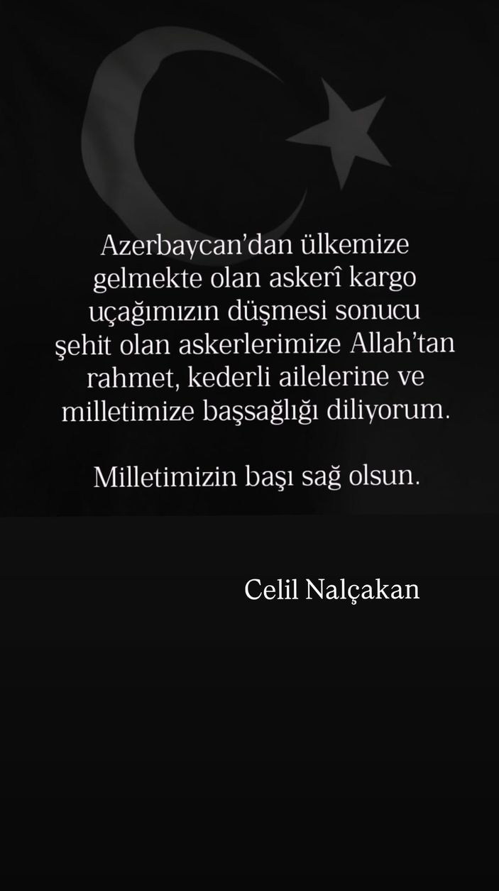 Celil Nalçakan: Azerbaycan'dan ülkemize gelmekte olan askeri kargo uçağımızın düşmesi sonucu şehit olan askerlerimize Allah'tan rahmet, kederli ailelerine ve milletimize başsağlığı diliyorum. Milletimizin başı sağ olsun.