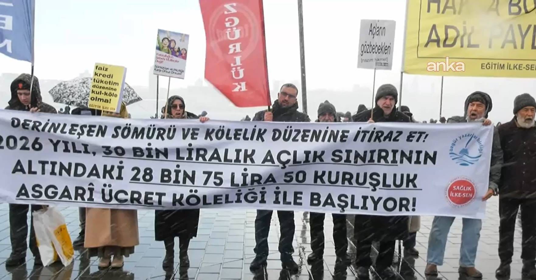 İstanbul’da Sağlık İlke-Sen ve Eğitim İlke-Sen üyeleri, 2026 asgari ücretinin 28 bin 75 TL olarak belirlenmesini protesto etmek için dondurucu soğuğa ve kar yağışına aldırmadan Üsküdar meydanına indi. Sık sık "Emekçiler köle olmayacak", "Asgari ücret azami köleliktir", "Yoksulluk büyüyor, açlık derinleşiyor" sloganlarının atıldığı açıklamada, iktidarın ekonomi politikalarına ve emekçiyi yok sayan ücret dayatmasına tepki yağdı.