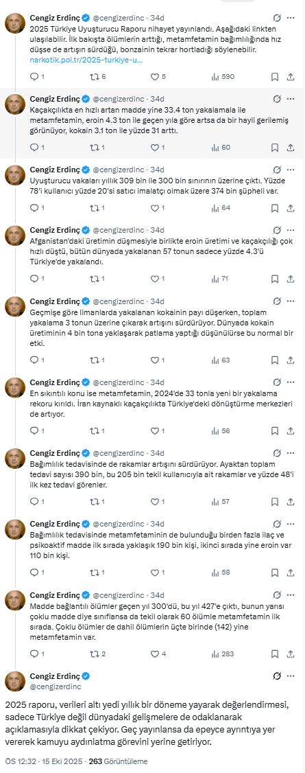 "KAÇAKÇILIKTA EN HIZLI ARTAN MADDE METAMFETAMİN OLDU"Gazeteci Cengiz Erdinç'in sosyal medya platformu X'te konuya ilişkin değerlendirmelerde bulundu. Erdinç, "Kaçakçılıkta en hızlı artan madde yine 33.4 ton yakalamala ile metamfetamin, eroin 4.3 ton ile geçen yıla göre artsa da bir hayli gerilemiş görünüyor, kokain 3.1 ton ile yüzde 31 arttı. Uyuşturucu vakaları yıllık 309 bin ile 300 bin sınırının üzerine çıktı. Afganistan'daki üretimin düşmesiyle birlikte eroin üretimi ve kaçakçılığı çok hızlı düştü, bütün dünyada yakalanan 57 tonun sadece yüzde 4.3'ü Türkiye'de yakalandı. Geçmişe göre limanlarda yakalanan kokainin payı düşerken, toplam yakalama 3 tonun üzerine çıkarak artışını sürdürüyor. Dünyada kokain üretiminin 4 bin tona yaklaşarak patlama yaptığı düşünülürse bu normal bir etki. En sıkıntılı konu ise metamfetamin, 2024'de 33 tonla yeni bir yakalama rekoru kırıldı. İran kaynaklı kaçakçılıkta Türkiye'deki dönüştürme merkezleri de artıyor" ifadelerini kullandı.