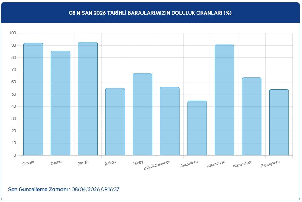 İSTANBUL BARAJLARINDA SON DURUMİSKİ’nin 8 Nisan 2026 tarihli güncel raporuna göre, İstanbul’un su ihtiyacını karşılayan ana havzalarda doluluk oranları şu şekilde sıralandı:
