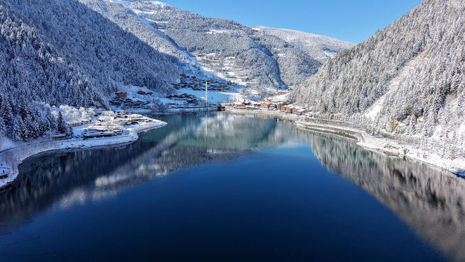 Karadeniz’de etkili olan kar yağışıyla çevresindeki ormanın beyaza büründüğü ünlü turizm merkezi Uzungöl, yaz turizminin yanında kışın da çeşitli aktivitelere ev sahipliği yapıyor.