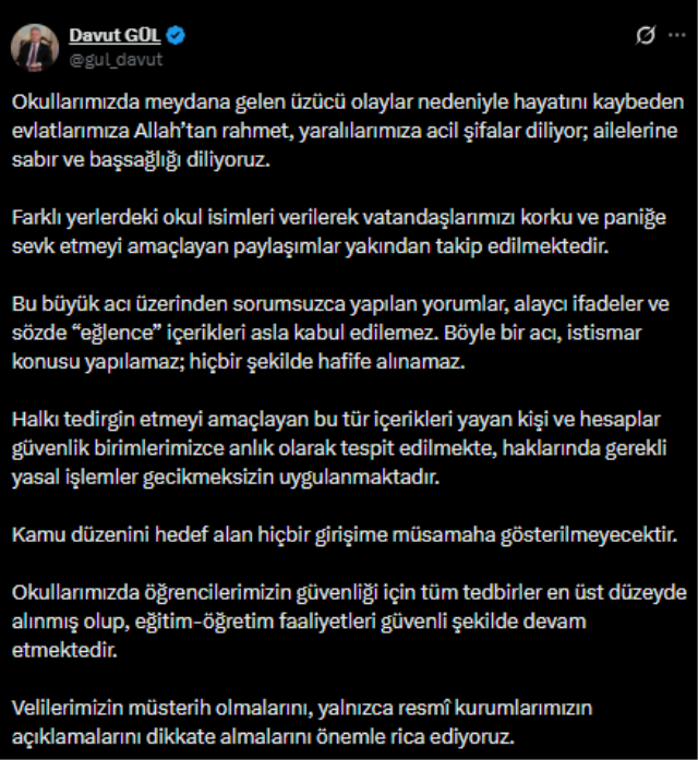 “BÖYLE BİR ACI, İSTİSMAR KONUSU YAPILAMAZ; HİÇBİR ŞEKİLDE HAFİFE ALINAMAZ”Konuya ilişkin sanal medya hesabından açıklamalarda bulunan İstanbul Valisi Davut Gül, "Okullarımızda meydana gelen üzücü olaylar nedeniyle hayatını kaybeden evlatlarımıza Allah'tan rahmet, yaralılarımıza acil şifalar diliyor; ailelerine sabır ve başsağlığı diliyoruz. Farklı yerlerdeki okul isimleri verilerek vatandaşlarımızı korku ve paniğe sevk etmeyi amaçlayan paylaşımlar yakından takip edilmektedir. Bu büyük acı üzerinden sorumsuzca yapılan yorumlar, alaycı ifadeler ve sözde 'eğlence' içerikleri asla kabul edilemez. Böyle bir acı, istismar konusu yapılamaz; hiçbir şekilde hafife alınamaz." dedi.