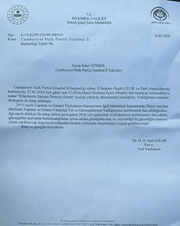Cumhuriyet Halk Partisi'nin köprülerin özelleştirilmesine karşı İstanbul'da yapmak istediği yürüyüşe Valilik'ten izin çıkmadı. CHP İstanbul İl Başkanı Özgür Çelik, konuya ilişkin açıklamalarda bulundu. Çelik, "Yarın Saat 17:00'de Beşiktaş Ortaköy'de… kararımızda bir değişiklik yok" açıklamasında bulundu.