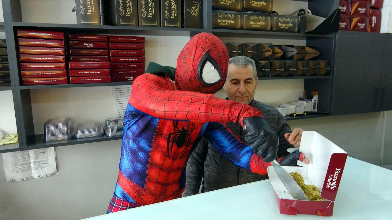 Örümcek Adam kostümüyle karşısında Ayaz Salih Koç’u gören Kaya, şaşkınlığını gizleyemedi.
