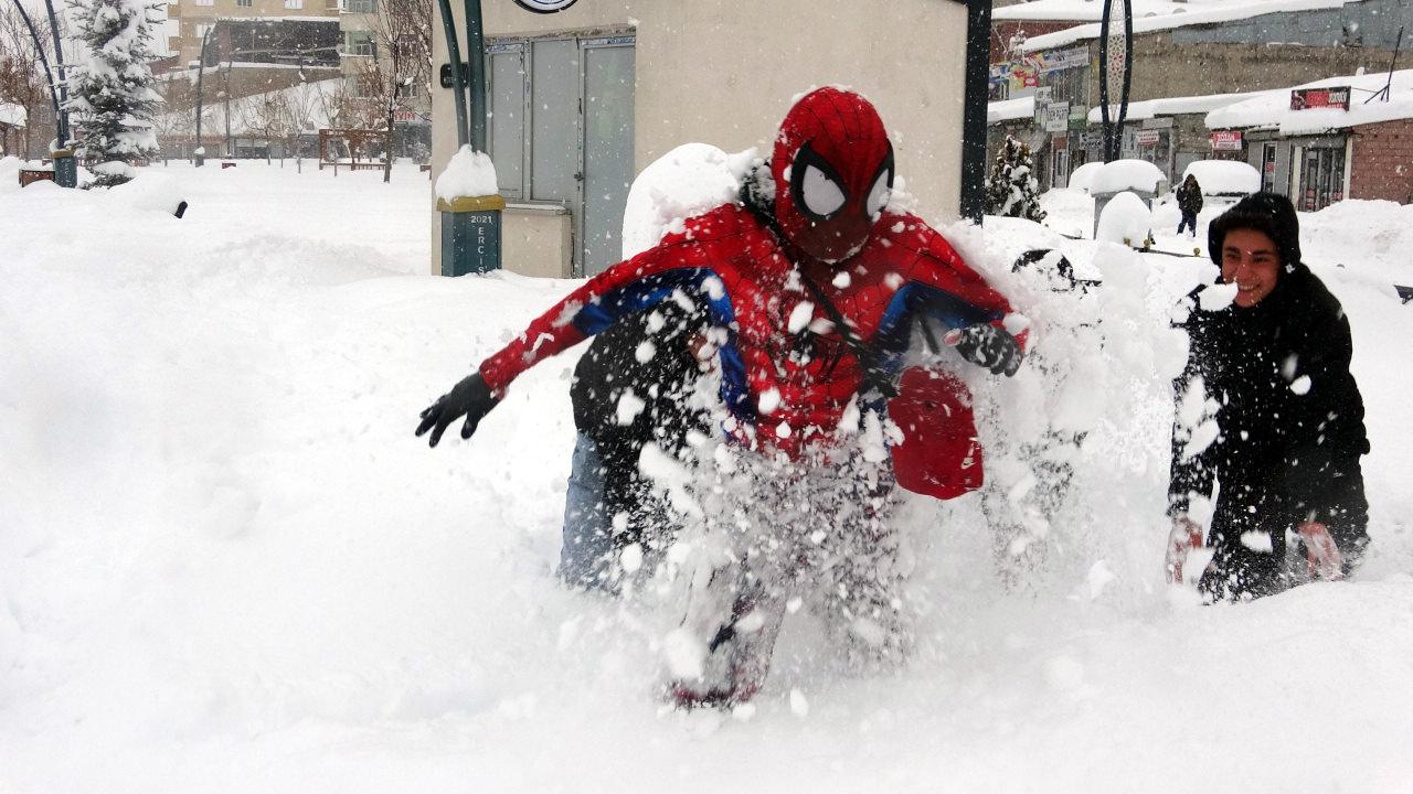 Türkiye'yi "Örümcek Adam" kostümüyle gezen Ayaz Salih Koç (26), geldiği Van'ın Erciş ilçesinde depremde yakınlarını kaybeden esnaf Murat Kaya'yı ziyaret etti. Kaldırım temizleyen Koç, çocuklarla kar topu oynadı.