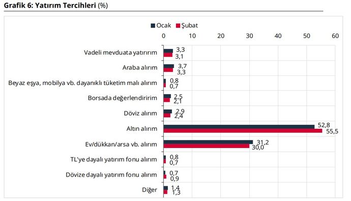 YATIRIM TERCİHİNDE 1 PUANLIK GERİLEME Katılımcıların yatırım tercihleri değerlendirildiğinde, 'ev/dükkan/arsa vb. alırım' tercihi 'altın alırım'ın ardından 2. sırada yer alıyor. Ocak ayında yüzde 31,2 olan tercih, şubat ayında yüzde 30'a geriledi.