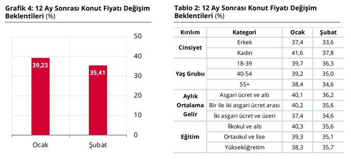 KADINLAR DAHA YÜKSEK ARTIŞ BEKLENTİSİNDETCMB, konut fiyatlarıyla ilgili beklentileri cinsiyet, yaş gibi kategorilere de ayırıyor. Buna göre; kadınların konut fiyatlarındaki artış konusunda beklentisi daha yüksek. Kadınlar 1 yıl sonrası için yüzde 37,8 artış beklerken, erkekler yüzde 33,6 artış bekliyor.