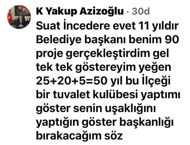 GAZETECİDEN YANITGazeteci Suat İncedere ise Başkan Azizoğlu'nun ifadelerine sert tepki göstererek "O ne biçim konuşma başkan, yeğen, uşak falan? Ben gazeteciyim. Beni oraya çağıran ve konuşan başkanlara da iki kelime etmedin, beni neden hedef seçtin? Biz yapılanı da yapılmayanı da görüyoruz. Sözlerini düzelt" şeklinde yanıt verdi.
