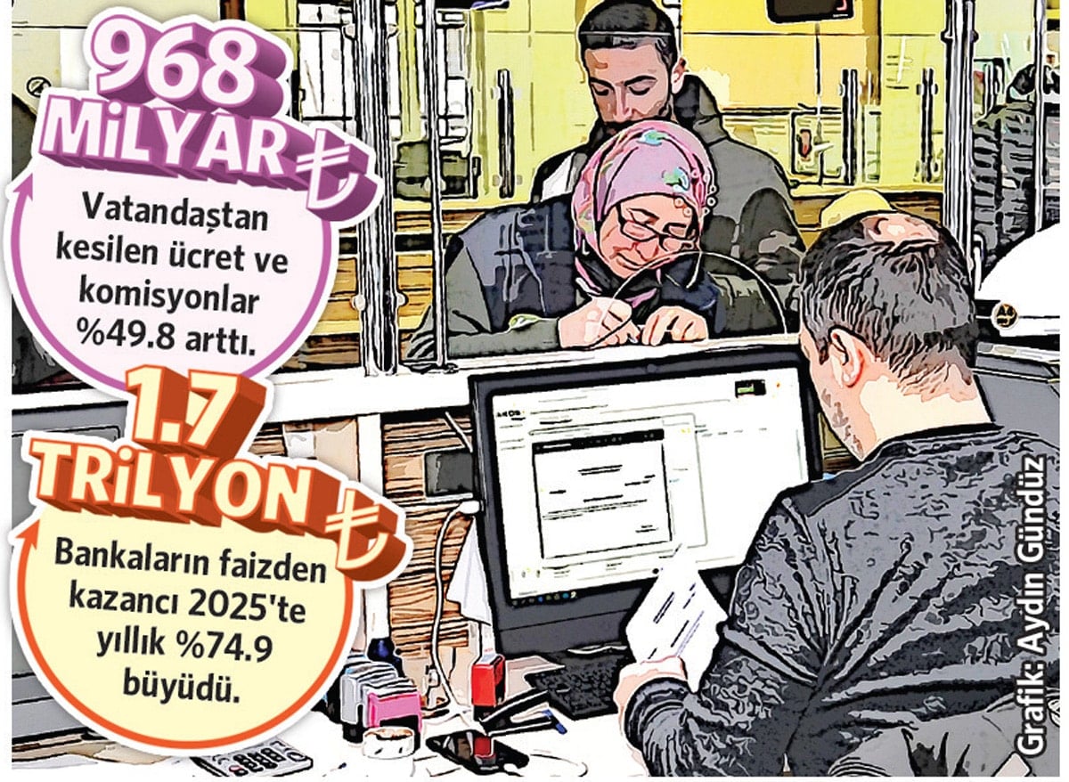 Vatandaşın yaptığı her para transferi, kredi işlemi ve kart harcaması da bankalara yeni kazanç kapısı oldu. Net ücret ve komisyon gelirleri yüzde 49.8 artışla 968 milyar lirayı aştı. Yüksek faiz ortamı bankaların gelirlerini hızla artırırken, işlem hacmindeki artış komisyon kazançlarını yukarı taşıdı.