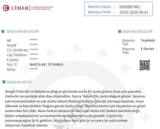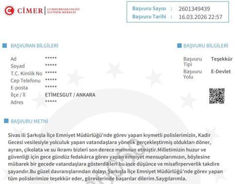 İletişim Başkanlığı'ndan yapılan açıklamaya göre, CİMER, bugün 10 Nisan Polis Günü'nü kutlayan polislere yönelik, vatandaşlar tarafından iletilen teşekkür başvurularında ilk adres oldu. Türkiye’nin dört bir yanından CİMER’e ulaşan binlerce teşekkür mektubu içeriğiyle, emniyet teşkilatının olaylara müdahale eden bir güç olmanın ötesinde, insani yaklaşımı ve çözüm odaklı duruşuyla hayatlara dokunan bir yapı olduğunu ortaya koydu. 2026 yılının ilk 3 ayında vatandaşların polislik hizmetlerine ilişkin CİMER’e yaptıkları teşekkür başvurularında, suçla mücadeleden trafik güvenliğine, dolandırıcılık olaylarından sosyal destek faaliyetlerine kadar geniş bir alanda görev yapan polislere minnet ifadeleri yer aldı. Zorlu hava koşullarında mahsur kalan vatandaşlara uzanan yardım eli, dolandırıcılık mağdurlarına yönelik hızlı müdahaleler, kaybolan eşyaların titizlikle bulunması için gösterilen çabalar, teşekküre mazhar konular olarak öne çıktı.