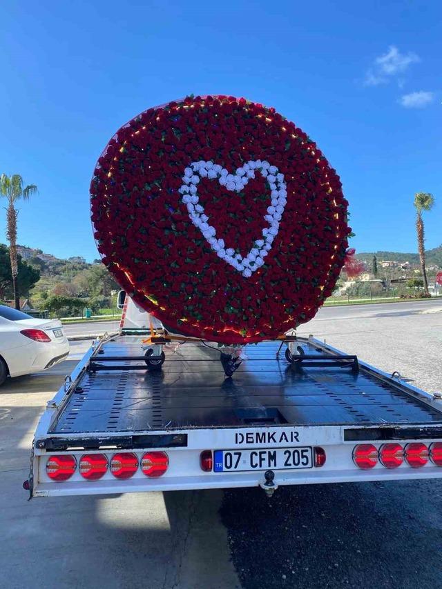 Antalya’nın Gazipaşa ilçesinde 14 Şubat Sevgililer Günü dolayısıyla çekicisinin vincini 777 gülle donatılmış buket haline getiren